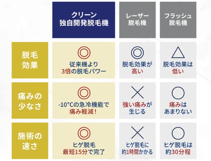 メンズクリーンでは独自開発した脱毛機を使用しています。この脱毛機は従来の3倍のパワーを実現しています。痛みに関するケアも万全で-10℃の急冷機能を搭載し痛みを軽減しています。